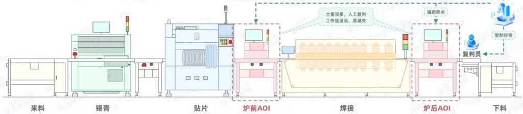 随着特征尺寸、复杂性和吞吐量方面的挑战越来越严峻,自动光学检测(AOI)成为确保对每个项目进行充分检测的唯一实用方法。但造成的后果往往是会有比较高的误报,还需要在炉前或者炉后安排复判员,对AOI设备报出的NG点位,进行二次复判。
